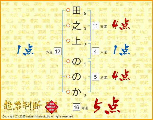 田(5画)之(3画)上(3画) の(1画)の(1画)か(3画)