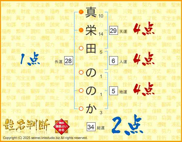 真(10画)栄(14画)田(5画) の(1画)の(1画)か(3画)