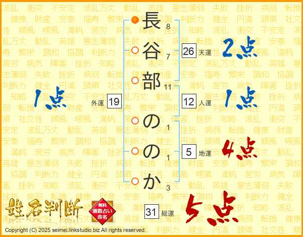 長(8画)谷(7画)部(11画) の(1画)の(1画)か(3画)