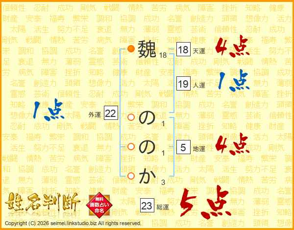 生活面を象徴する運勢です。外部から受ける影響力を表し、結婚運、家庭運や職場、環境への順応性を表します。総運から人運を引いた画数。姓や名が1文字の場合を除く。