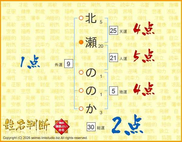 北(5画)瀬(20画) の(1画)の(1画)か(3画)