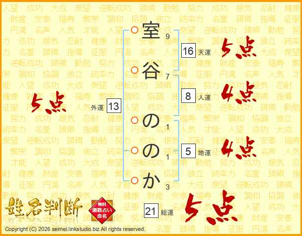 室谷ののかさんの総運は21画の5点!