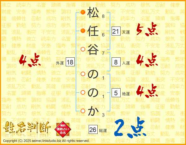 松(8画)任(6画)谷(7画) の(1画)の(1画)か(3画)