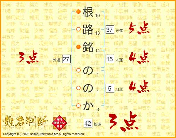 根(10画)路(13画)銘(14画) の(1画)の(1画)か(3画)