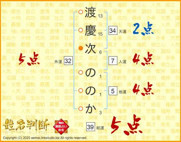 渡(13画)慶(15画)次(6画) の(1画)の(1画)か(3画)
