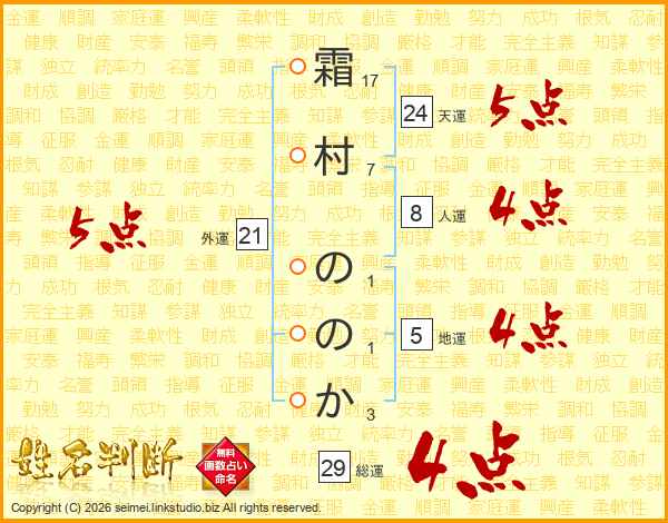 霜(17画)村(7画) の(1画)の(1画)か(3画)