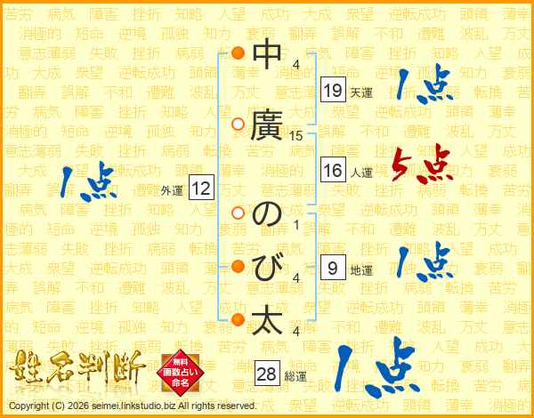 中(4画)廣(15画) の(1画)び(4画)太(4画)