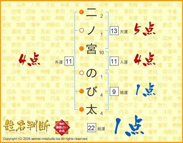 生活面を象徴する運勢です。外部から受ける影響力を表し、結婚運、家庭運や職場、環境への順応性を表します。総運から人運を引いた画数。姓や名が1文字の場合を除く。