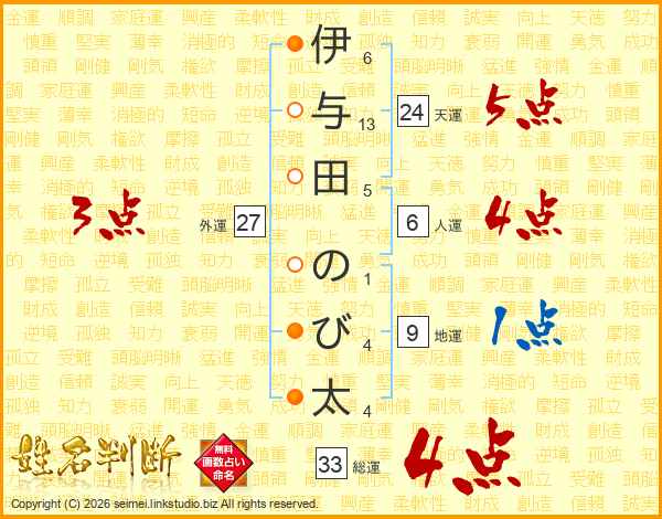 伊与田のび太さんの総運は33画の4点!