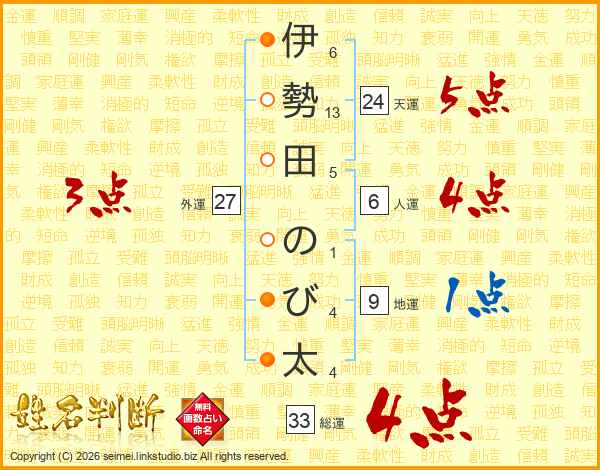 伊勢田のび太さんの総運は33画の4点!