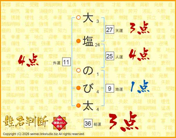 大(3画)塩(24画) の(1画)び(4画)太(4画)