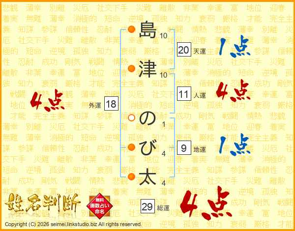 島(10画)津(10画) の(1画)び(4画)太(4画)