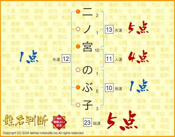 二ノ宮のぶ子さんの総運は23画の5点!