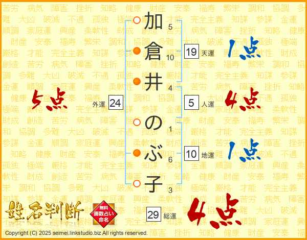 加(5画)倉(10画)井(4画) の(1画)ぶ(6画)子(3画)
