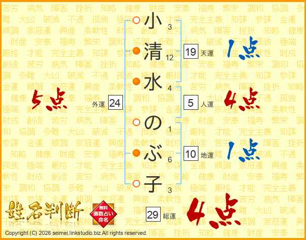 小清水のぶ子さんの総運は29画の4点!