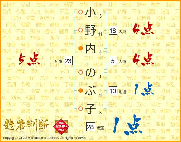 小野内のぶ子さんの総運は28画の1点!