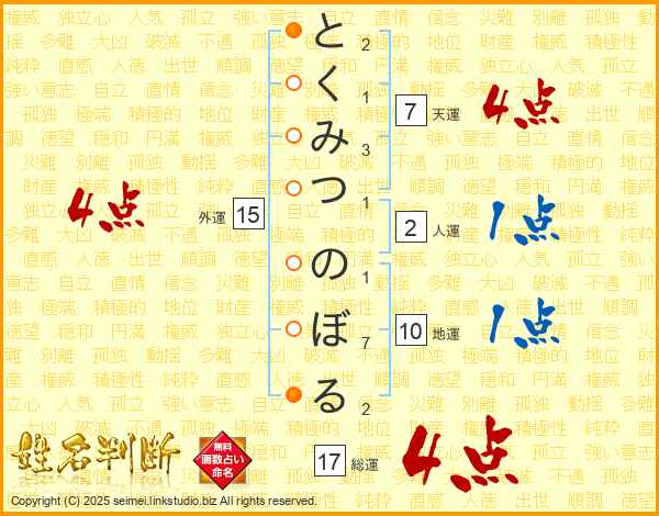 生活面を象徴する運勢です。外部から受ける影響力を表し、結婚運、家庭運や職場、環境への順応性を表します。総運から人運を引いた画数。姓や名が1文字の場合を除く。