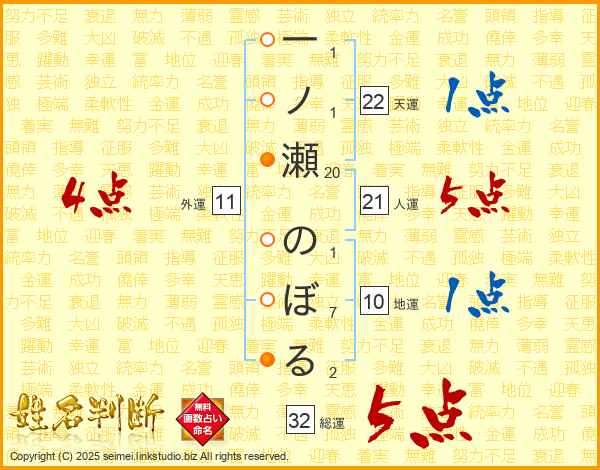 あなたの人生を表す1番重要な運勢です。生涯を通じて影響する総合運となり、主に50歳以降の晩年期に影響を及ぼします。苗字と名前の合計画数。