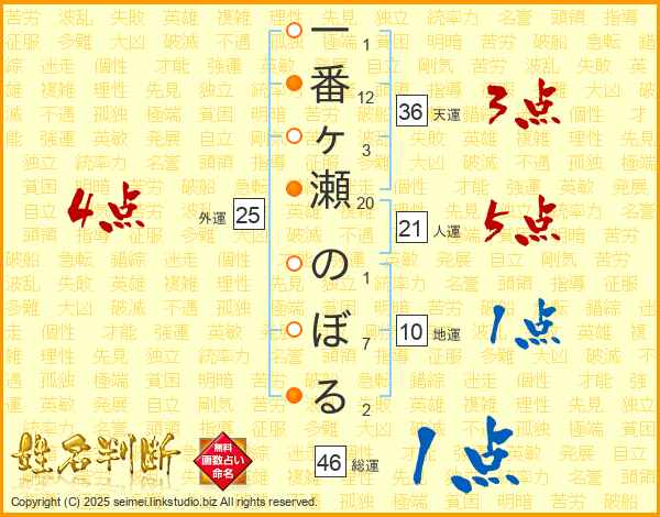 一番ヶ瀬のぼるさんの総運は46画の1点!
