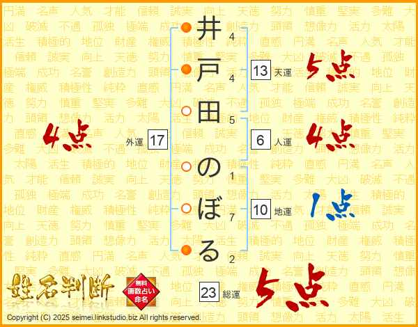 井(4画)戸(4画)田(5画) の(1画)ぼ(7画)る(2画)