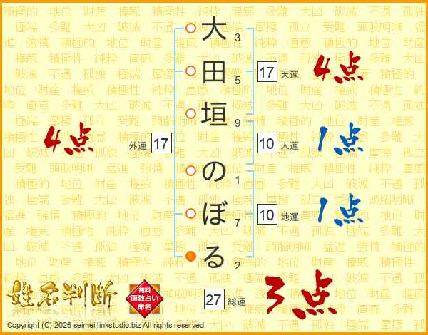 大田垣のぼるさんの総運は27画の3点!