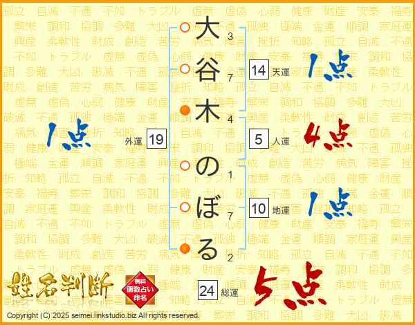大(3画)谷(7画)木(4画) の(1画)ぼ(7画)る(2画)