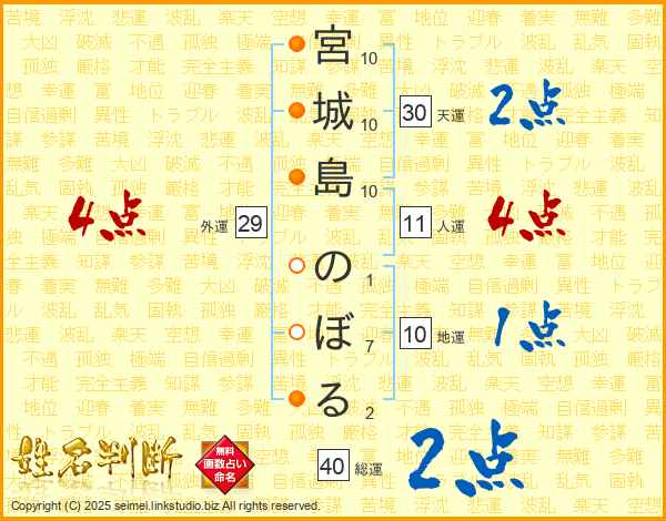 宮(10画)城(10画)島(10画) の(1画)ぼ(7画)る(2画)