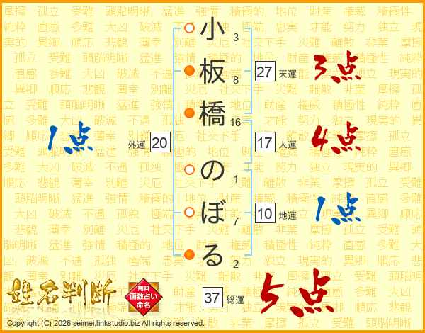 小(3画)板(8画)橋(16画) の(1画)ぼ(7画)る(2画)