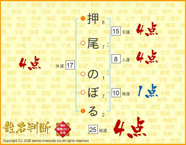 生活面を象徴する運勢です。外部から受ける影響力を表し、結婚運、家庭運や職場、環境への順応性を表します。総運から人運を引いた画数。姓や名が1文字の場合を除く。