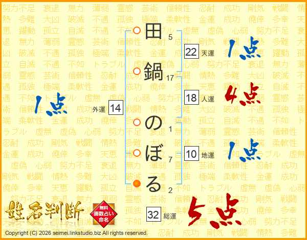 田鍋のぼるさんの総運は32画の5点!