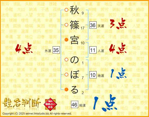 秋(9画)篠(17画)宮(10画) の(1画)ぼ(7画)る(2画)