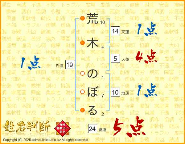 荒(10画)木(4画) の(1画)ぼ(7画)る(2画)