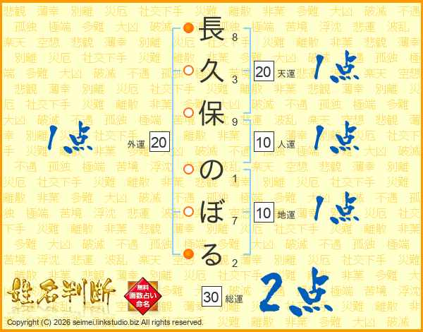 長(8画)久(3画)保(9画) の(1画)ぼ(7画)る(2画)