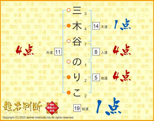 生活面を象徴する運勢です。外部から受ける影響力を表し、結婚運、家庭運や職場、環境への順応性を表します。総運から人運を引いた画数。姓や名が1文字の場合を除く。