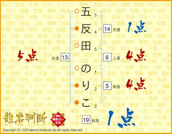 生活面を象徴する運勢です。外部から受ける影響力を表し、結婚運、家庭運や職場、環境への順応性を表します。総運から人運を引いた画数。姓や名が1文字の場合を除く。