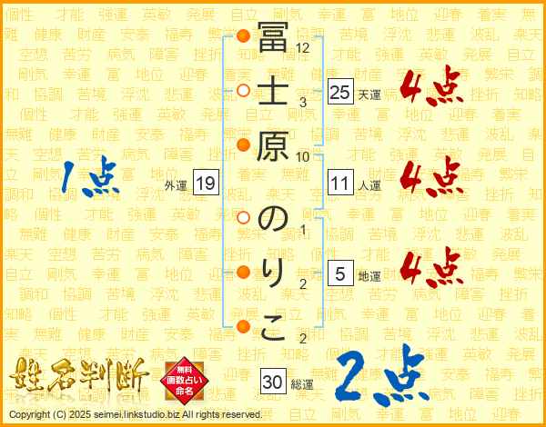 生活面を象徴する運勢です。外部から受ける影響力を表し、結婚運、家庭運や職場、環境への順応性を表します。総運から人運を引いた画数。姓や名が1文字の場合を除く。