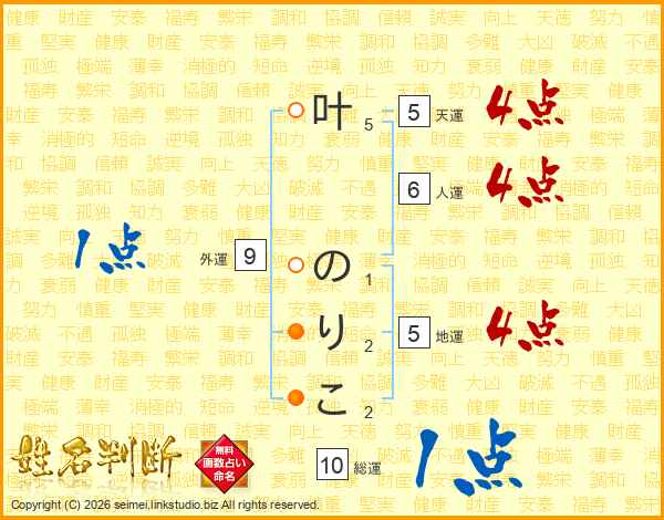 生活面を象徴する運勢です。外部から受ける影響力を表し、結婚運、家庭運や職場、環境への順応性を表します。総運から人運を引いた画数。姓や名が1文字の場合を除く。