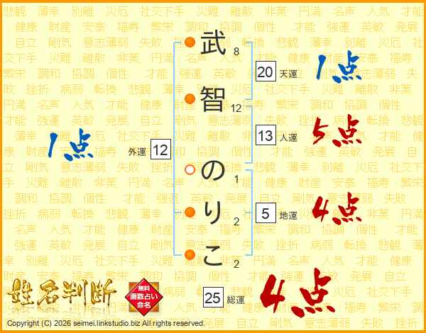 武(8画)智(12画) の(1画)り(2画)こ(2画)