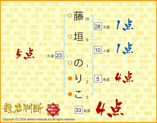 藤垣のりこさんの総運は33画の4点!