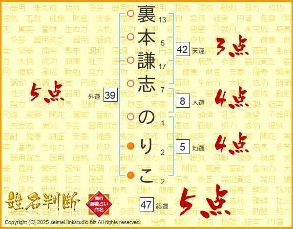 裏(13画)本(5画)謙(17画)志(7画) の(1画)り(2画)こ(2画)
