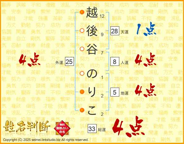 生活面を象徴する運勢です。外部から受ける影響力を表し、結婚運、家庭運や職場、環境への順応性を表します。総運から人運を引いた画数。姓や名が1文字の場合を除く。