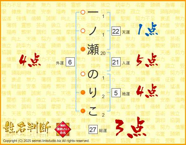 生活面を象徴する運勢です。外部から受ける影響力を表し、結婚運、家庭運や職場、環境への順応性を表します。総運から人運を引いた画数。姓や名が1文字の場合を除く。
