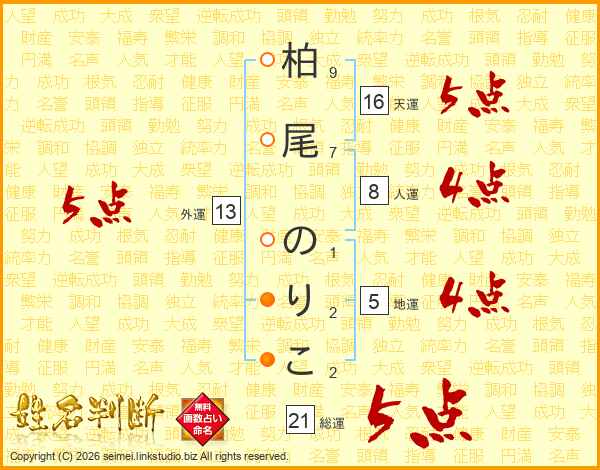 生活面を象徴する運勢です。外部から受ける影響力を表し、結婚運、家庭運や職場、環境への順応性を表します。総運から人運を引いた画数。姓や名が1文字の場合を除く。