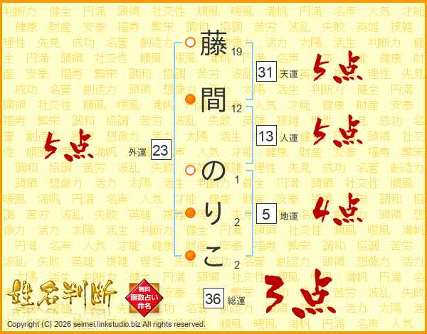 藤間のりこさんの人運は13画の5点!