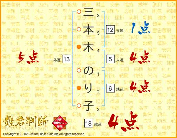 三(3画)本(5画)木(4画) の(1画)り(2画)子(3画)