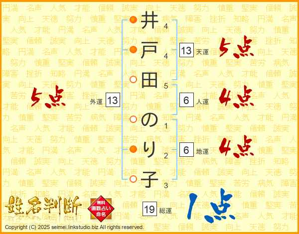 生活面を象徴する運勢です。外部から受ける影響力を表し、結婚運、家庭運や職場、環境への順応性を表します。総運から人運を引いた画数。姓や名が1文字の場合を除く。