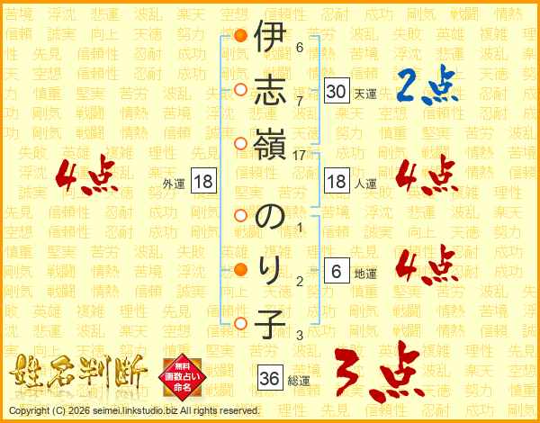 伊(6画)志(7画)嶺(17画) の(1画)り(2画)子(3画)