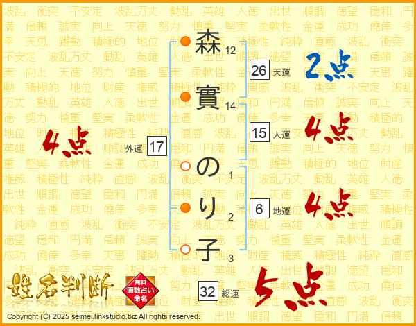 森(12画)實(14画) の(1画)り(2画)子(3画)
