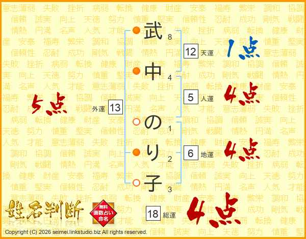 武(8画)中(4画) の(1画)り(2画)子(3画)