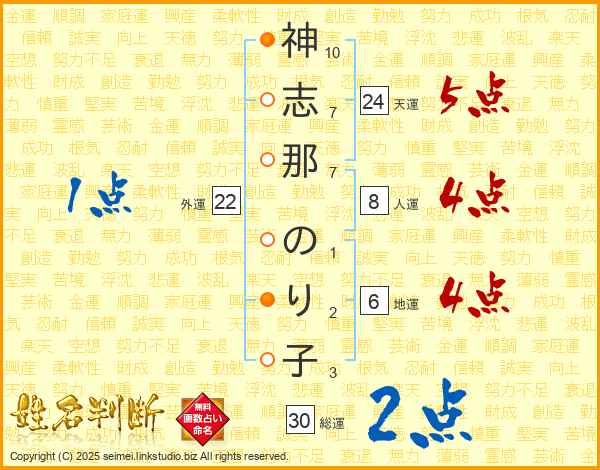 神(10画)志(7画)那(7画) の(1画)り(2画)子(3画)